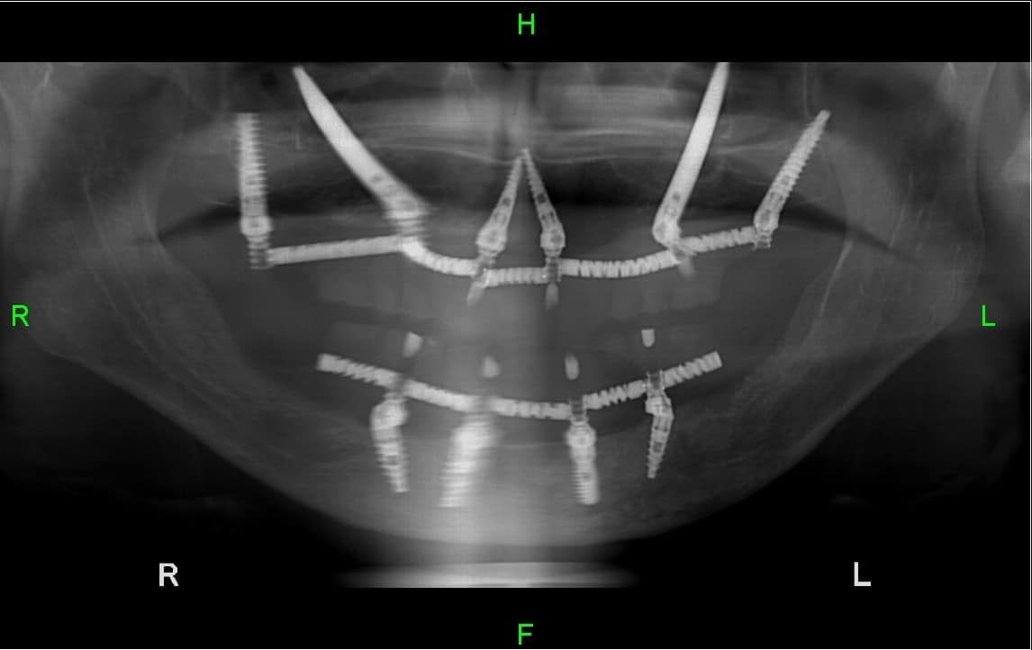 In this x-ray below presents what the 4 implants that have been inserted into the patient’s upper and lower jaws look like.
