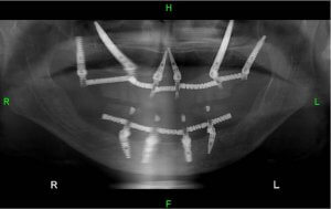 Скуловые импланты, имплантированы в обе стороны верхней челюсти пациента.
